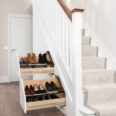 Memaksimalkan ruang di bawah tangga dengan cara memfungsikannya sebagai rak bisa menjadi alternatif penyimpanan sepatu. Lokasi penyimpanan ini memang harus dibuat secara DIY, tetapi cara ini mampu memberikan banyak manfaat. Selain sepatu, banyak barang, seperti pernak-pernik rumah bisa diletakkan di sini.Â