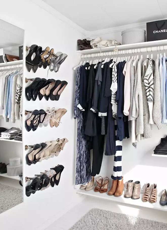 Jika ingin menghemat ruang dan memiliki walk in closet namun tidak ada area yang tersedia, jangan khawatir. Anda bisa mengganti fungsi lemari baju jadi lemari sepatu sebagai alternatifnya. Cukup dengan memberi sekat di antara rak yang di dalam lemari baju, Anda sudah dapat mengubahnya menjadi lemari sepatu.