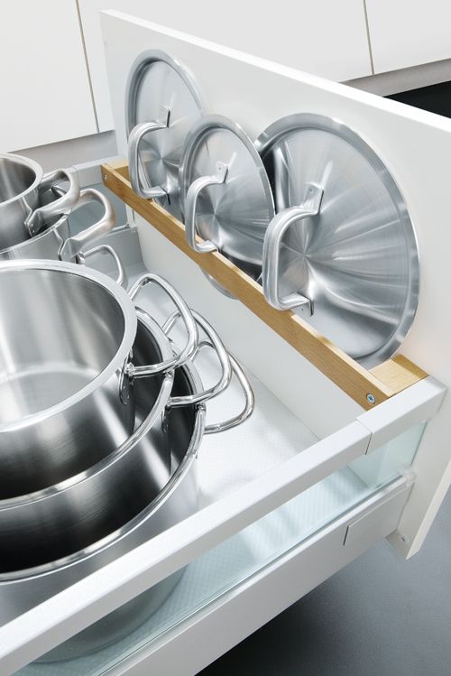 Selain menjadi penutup kabinet, Anda bisa menggunakan pintu kabinet sebagai tempat untuk meletakan tutup panci yang berbentuk pipih dan sebaiknya diletakan dibawah untuk mempermudah saat dibutuhkan. Konsep ini bisa digunakan untuk memaksimalkan tempat yang terbatas, panci-panci yang ada juga bisa diletakan dibawah dengan cara memasukan panci kecil kedalam panci yang lebih besar.