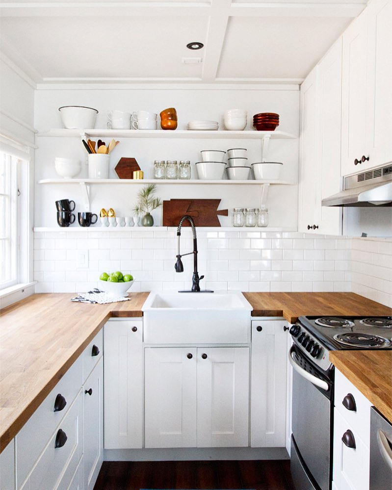 Penggunaan kabinet pada dapur kecil bisa memberikan efek sesak dan tertutup untuk ruangan. Untuk membuat kesan yang lebih lega dan lapang, Anda bisa beralih untuk menggunakan rak dinding terbuka sebagai gantinya. Selain itu, ternyata rak terbuka juga bisa membantu menjaga peralatan dari kelembapan dan menghemat waktu dalam mencari peralatan yang diperlukan.