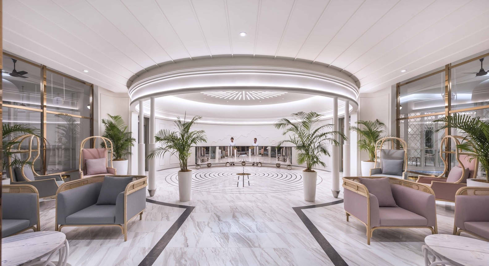 Masuk ke bagian resepsionis, rangkaian lampu neon membentuk pola lingkaran di bagian atap, selaras dengan bentuk ruangan yang juga berbentuk sirkular.