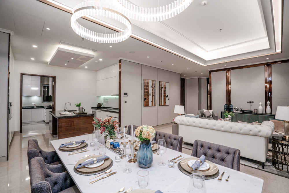 Interior Anandamaya Residence tampil elegan berkat drop ceiling serta palet putih pada dinding dan sofa/ Astra Property