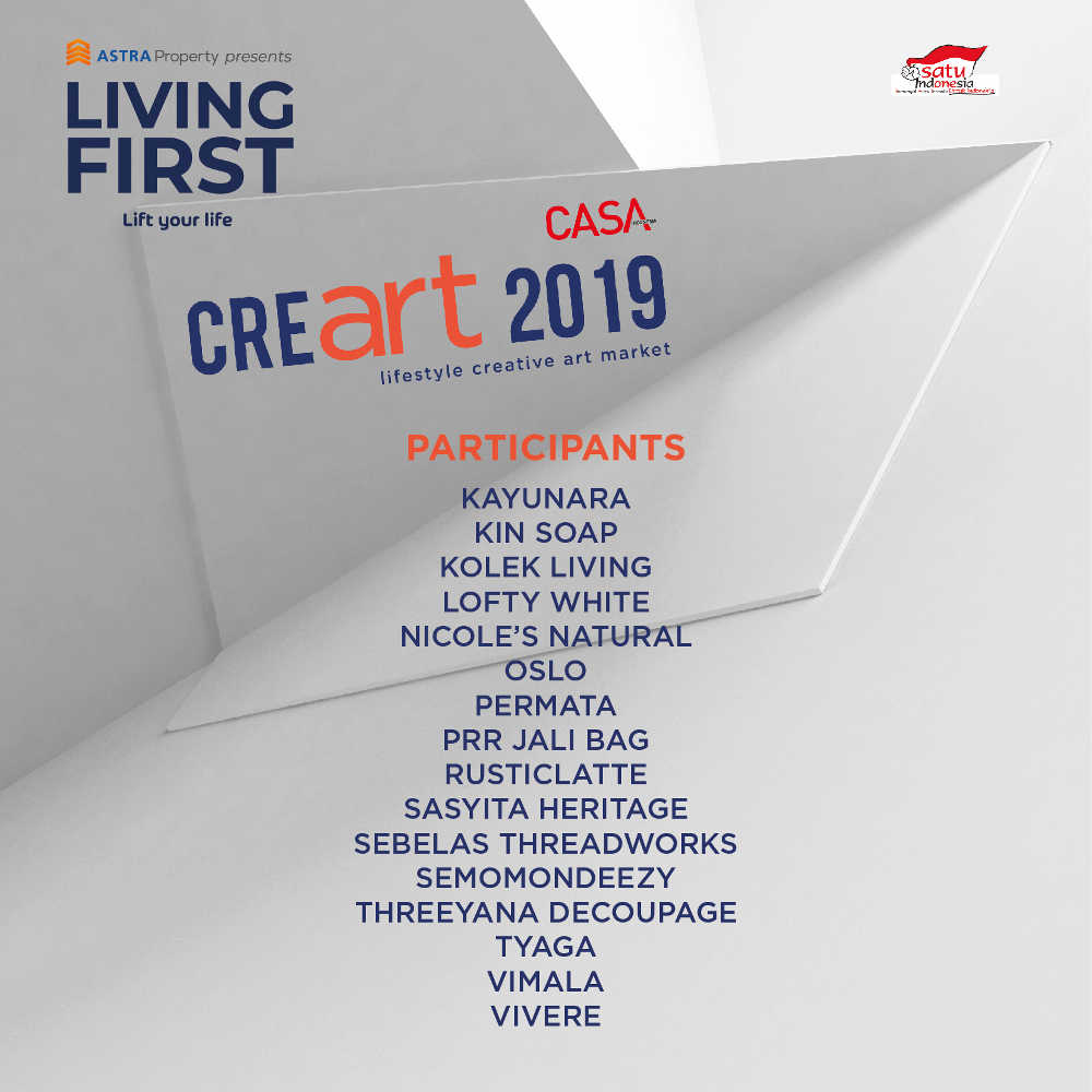 Meningkatkan kualitas hidup bisa dimulai melalui dukungan produk-produk berkualitas. CREART 2019 menggandeng lebih dari 20 tenant, mulai dari pengembang, perusahaan furnitur, aksesori, studio desain, hingga perusahaan beauty products untuk menampilkan produk-produk mereka di pameran nanti.