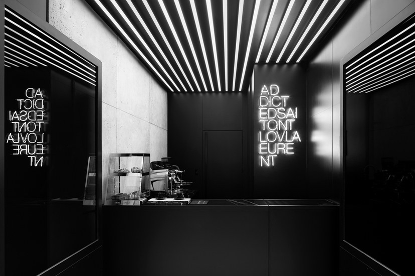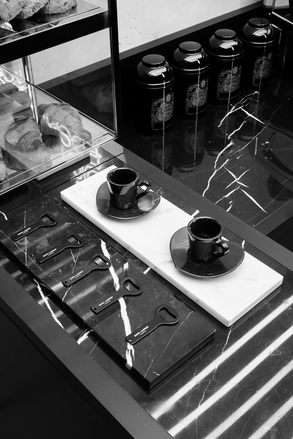 Setia pada gaya elegan dan minimalisnya, Cafe dari brand ternama milik Yves Saint Laurent dan Pierre Berge ini dirancang dengan dekorasi marmer hitam yang diterangi lampu neon. Tempat ini menawarkan semua jenis kopi a la carte yang dibuat menggunakan bagian atas Faema E61, favorit barista serta beragam pilihan kue kering. Berbeda dari kafe yang lain, pengunjung diminta untuk menggunakan QR code yang berisi playlist eksklusif yang sudah dipilih oleh house of Saint Laurent dan dapat dinikmati saat pengunjung masuk ke dalam rumah mode terkenal ini.