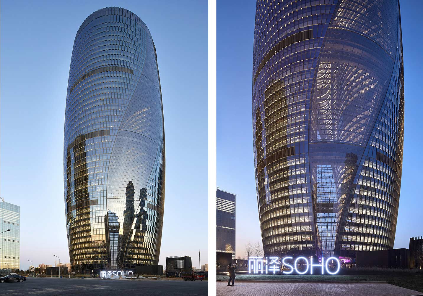 Gedung bertingkat 45 lantai tersebut akan difungsikan sebagai ruang perkantoran untuk bisnis kecil dan menengah dan telah menerima penghargaan LEED Gold Certification sebagai gedung ramah lingkungan dari US Green Building Council. Arsitektur Leeza SOHO memiliki siluet yang anggun yang terinspirasi dari posisi ‘pas de deux‘, salah satu posisi dansa atau balet hingga menggambarkan bentuk layaknya tubuh sedang memutar saat berdansa. Bentuk-bentuk meliuk di dalam konstruksi gedung tersebut memiliki jembatan yang saling menghubungkan antar lantai.