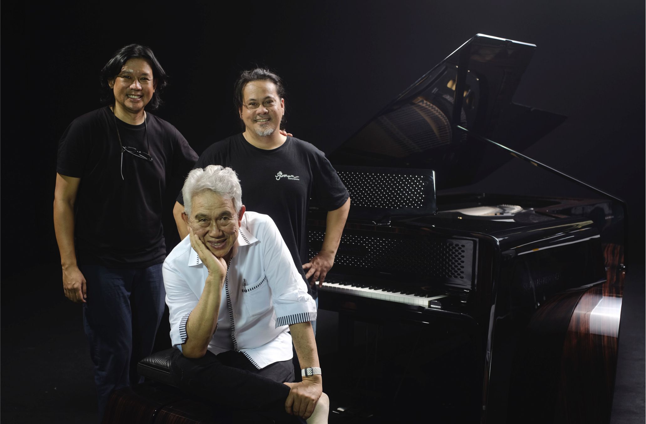 Aksan Sjuman, Raul Renanda, dan Harsono Enggalhardjo (Saniharto) berfoto bersama di samping piano SR1928 – The Awakening