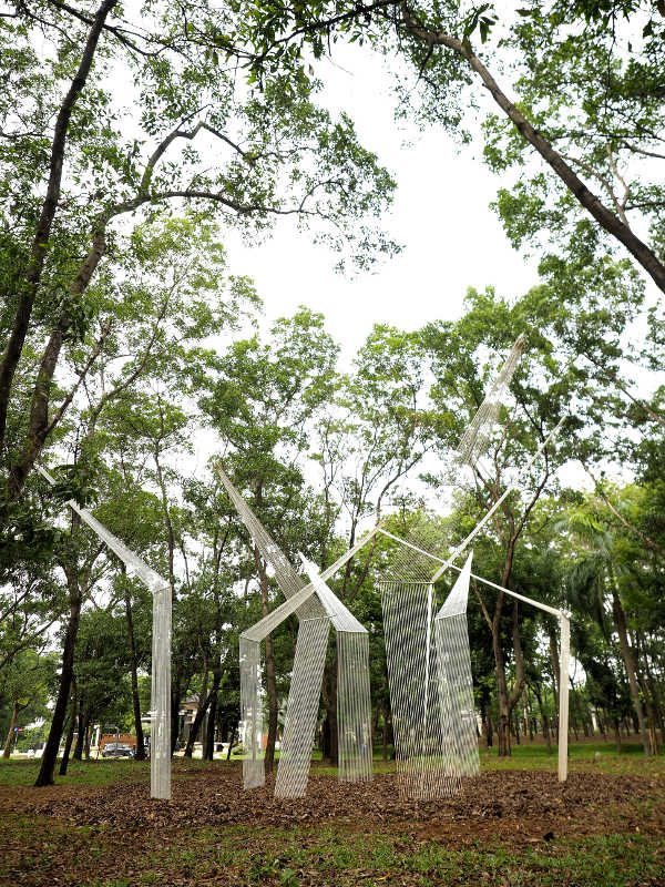 Instalasi karya Rubi Roesli dari Biroe Architecture & Interior ini menampilkan deretan tambang nylon putih yang tersusun dan ditarik menggunakan sling melalui pohon-pohon di sekitarnya.
