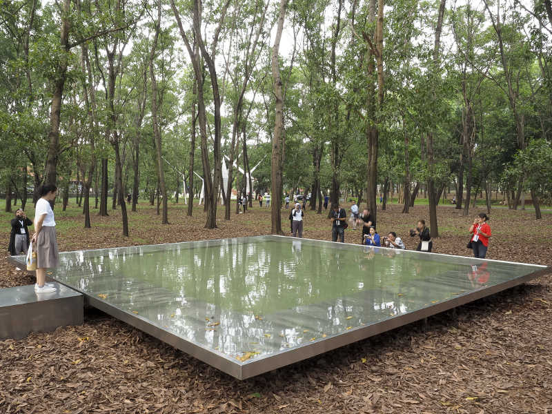 Instalasi unik bernama Genang ini didesain oleh Adria Ricardo, principal architects dari Adria Yurike Architects. Genang menampilkan instalasi berbentuk wadah persegi stainless steel yang dangkal, lalu diisi dengan air.