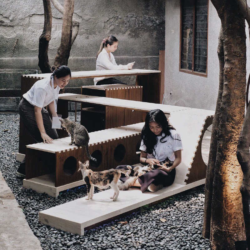 Konsep inklusif memang tidak membatasi diri hanya untuk manusia saja. Ruang yang inklusif juga harus ramah untuk semua makhluk hidup, termasuk kucing. Didesain oleh Seniman Ruang, Playmat merupakan instalasi cum gerakan untuk lebih melindungi kucing-kucing liar di jalanan.