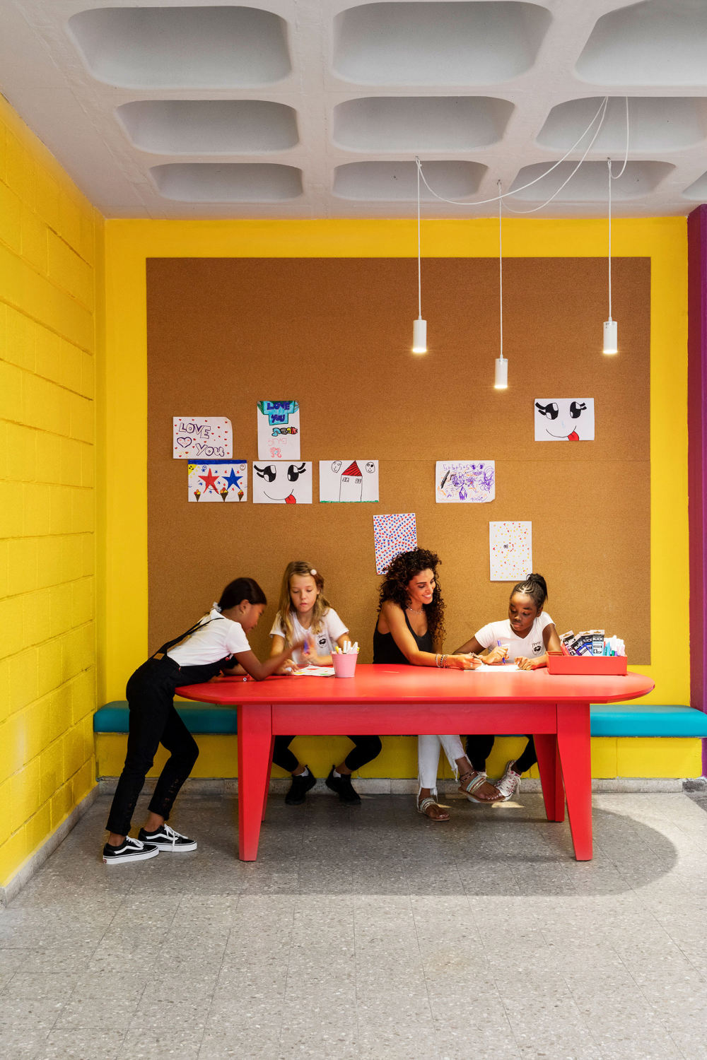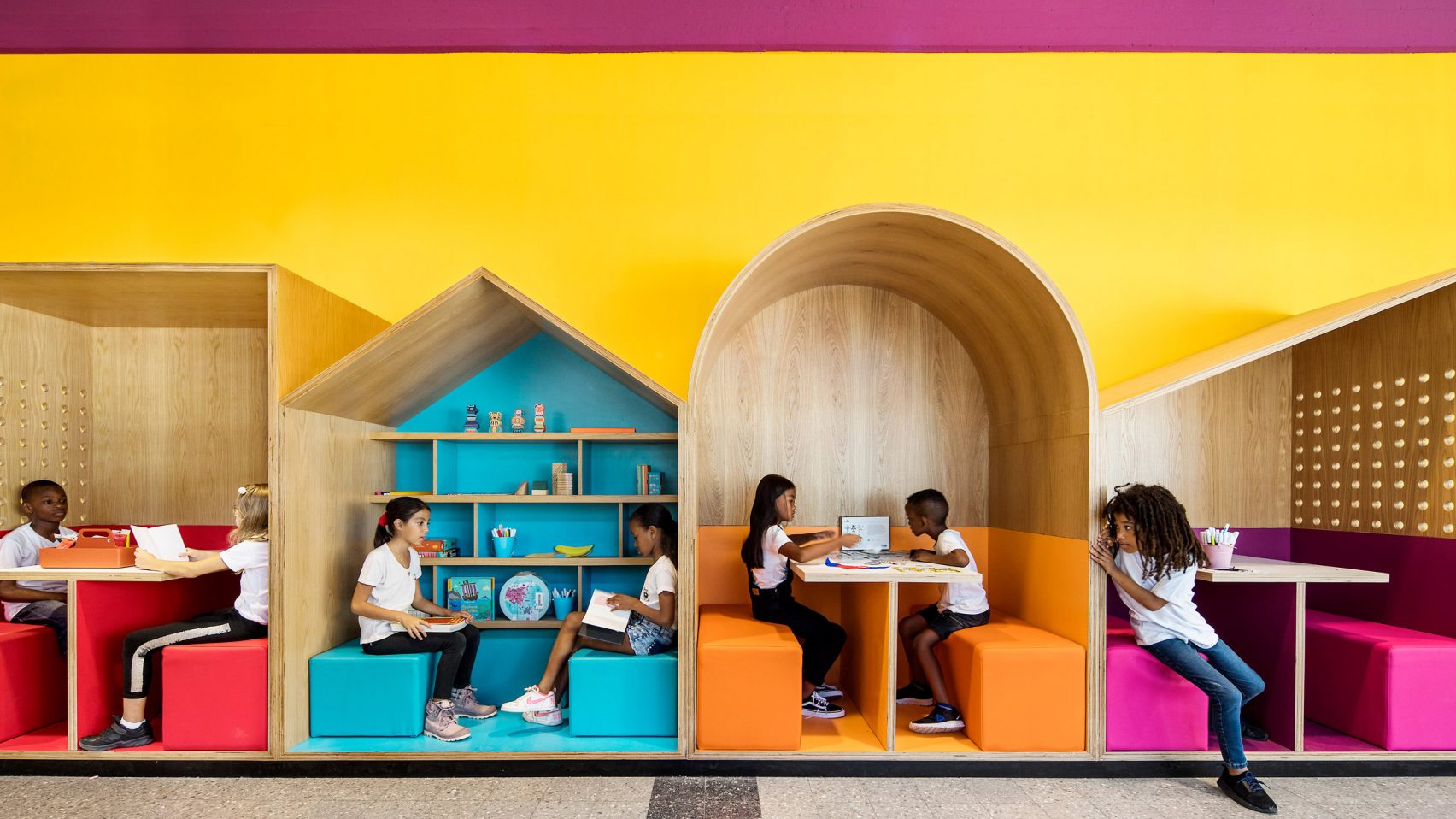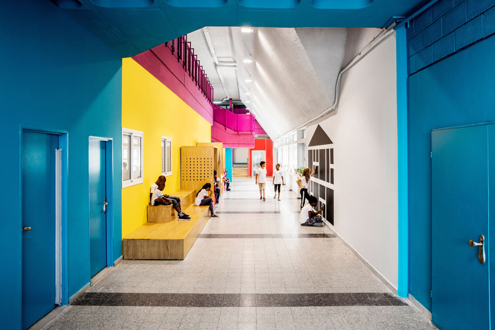 Bertujuan untuk mendorong mereka belajar, para desainer pun merombak ulang lantai bawah dari bangunan yang sudah ada sejak tahun 1960 ini. Penambahan elemen sederhana juga turut dihadirkan, tentunya tetap menarik dan menyenangkan bagi para anak-anak.