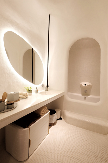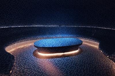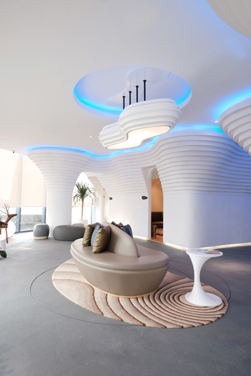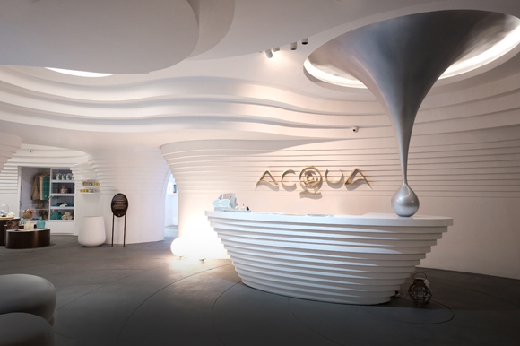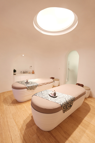 Sesaat memasuki spa, tamu akan disambut oleh bentangan dinding putih yang membentuk lapisan gelombang. Studio LMA (PT Lake Mega Amerta) selaku desainer interior yang berbasis di Bandung ini menghadirkan suasana dan konsep city of Atlantis untuk seluruh area.Â