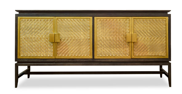 Furnitur kayu jati sebesar 180 x 50 x 90 cm dengan finishing charcoal grey tampil menawan bersama anyaman honey synthetic di daun pintu lemarinya.