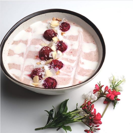 Tak salah jika mendedikasikan momen Valentine ini untuk kesehatan diri. Semangkuk smoothies paduan pisang, strawberry, dan mawar ini diberi nama Love Potion. Taburan raspberries dan buah naga merah di atasnya menambah kesan suasana Valentine.