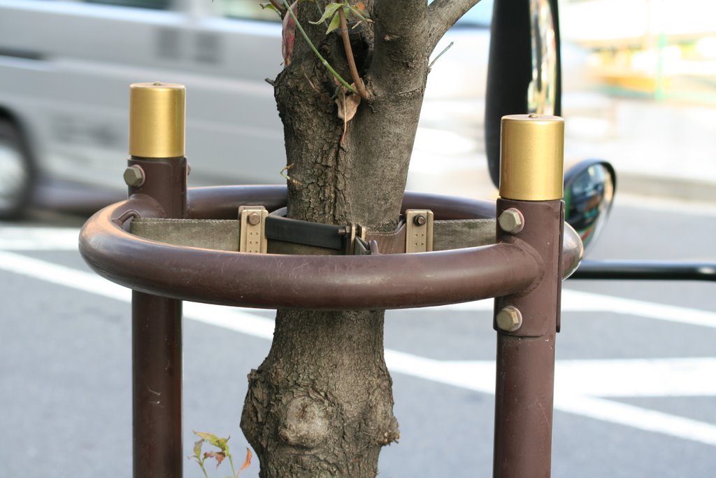 Penyangga pohon menggunakan rangka besi / Here and There Japan