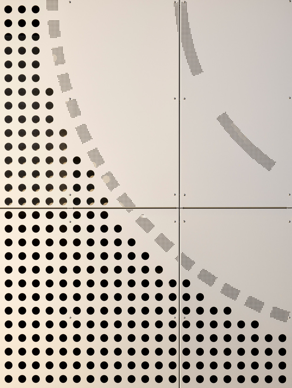 Seluruh bagian fasad yang dibalut oleh panel alumunium yang langsung menggambarkan pelat jalan asli. Polanya pun terdiri dari sembilan jenis bagian yang berbeda. Tentunya, dengan memiliki ukuran perforasi yang mengikuti dimensi dan rasio bata Lego pada umumnya.