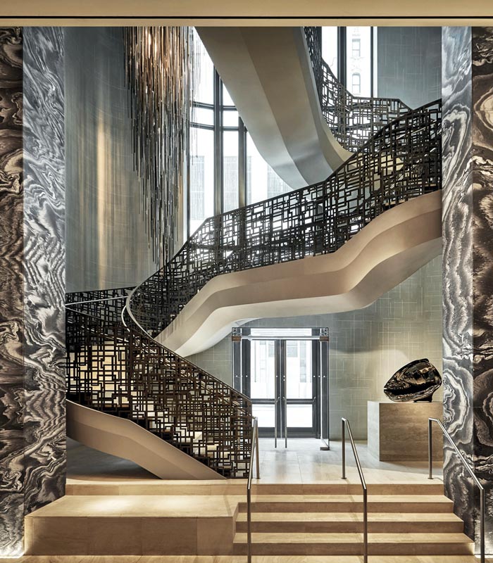 Grand staircase dengan railing perunggu mengambil peran yang paling dramatis. Bagi Peter Humig selaku General Manager Four Seasons Hotel New York, tangga yang diukir selayaknya art piece ini dianggap menawan sebagai latar belakang bagi para pengantin yang ingin menikah di sini.