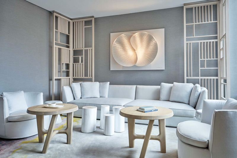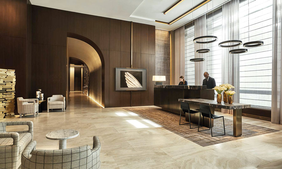 Yabu Pushelberg, desainer interior yang memiliki studio desain di Soho dan Toronto merancang inci demi inci, tidak ada yang tidak tersentuh tanpa detail yang menakjubkan. Bersandingan dengan dinding kayu dan woven metal screen, hamparan lantai travertine berwarna cream dan sedikit sentuhan karpet wol memberikan paras yang memukau di area lobby.
