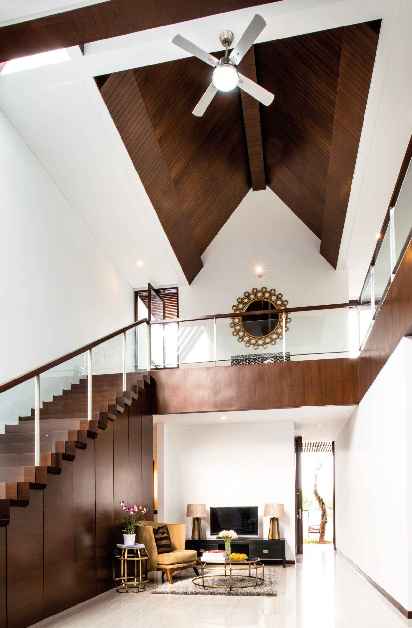 Dengan perhitungan yang cermat, aliran udara dapat diarahkan menyilang di lantai satu dan lantai dua, sehingga dapat mengoptimalkan sirkulasi udara alami. Sistem void juga dapat membantu memberikan kesan rumah yang lebih lapang. Gunakan material kayu sebagai aksentuasi di ceiling agar menambah kesan hangat, seperti rumah karya Parametr Architecture ini.