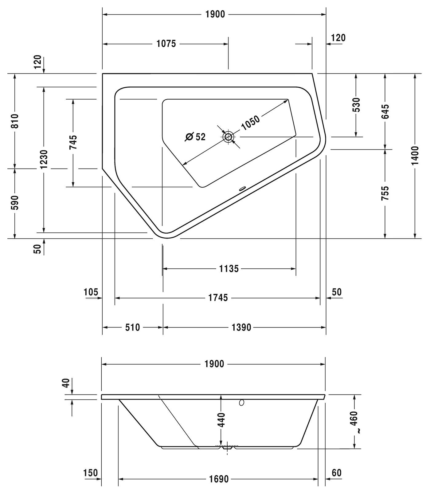 Hadir dalam ukuran 1700 x 1300 mm dan 1900 x 1400 mm, bath tub ini nyaman digunakan hingga dua orang dengan lapang. Karena kebutuhan relaksasi setiap orang beragam, kedua sisi bath tub ini memiliki sudut kemiringan yang berbeda pula, 40° dan 46°.