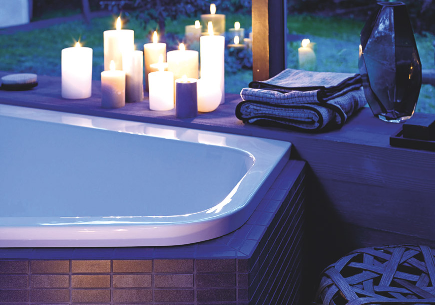 Hadir juga dalam versi built-in, Duravit menyediakan dinding keramik yang menyelimuti dengan elegan serta dapat difungsikan sebagai storage dan meja untuk menaruh lilin atau wine.