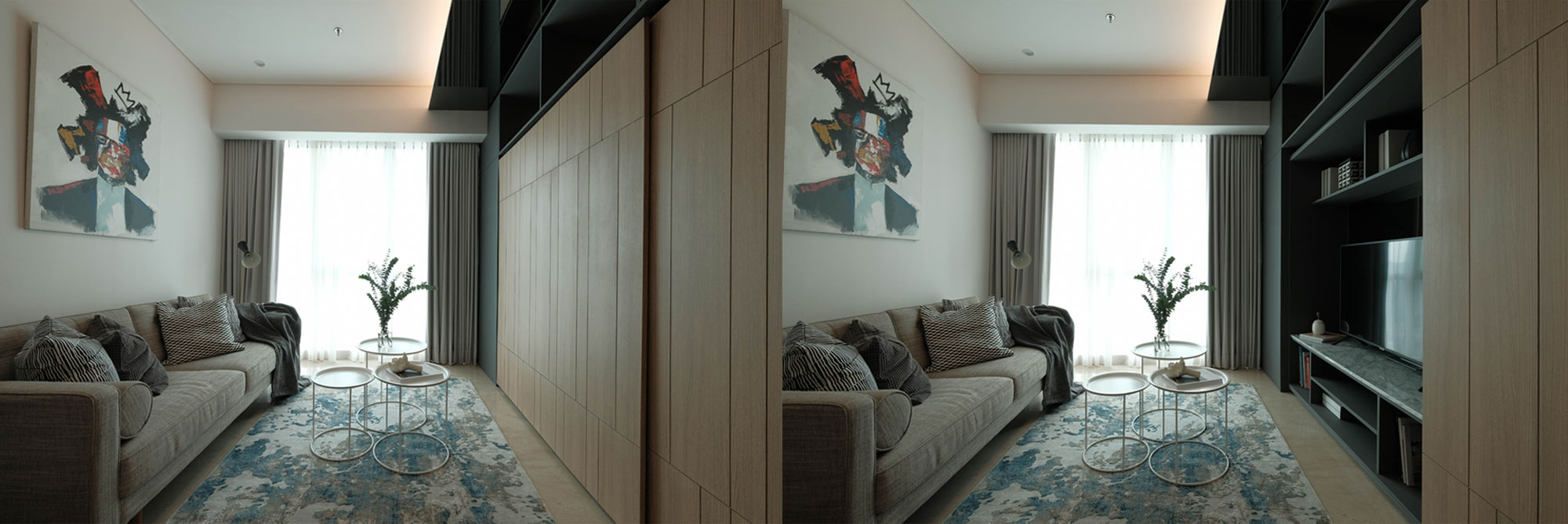 Living room pada hunian vertikal dapat memberikan pencahayaan alami sekaligus pemandangan yang indah dari ketinggian. Optimalisasikan area balkon yang tak tersentuh sebagai ruang keluarga tambahan dengan desain yang serupa. Jika ruang tamu ada memiliki ukuran yang kecil, jangan terlalu banyak menempatkan furnitur. Satu sofa dan corner table saja sudah cukup agar sirkulasi gerak lebih banyak