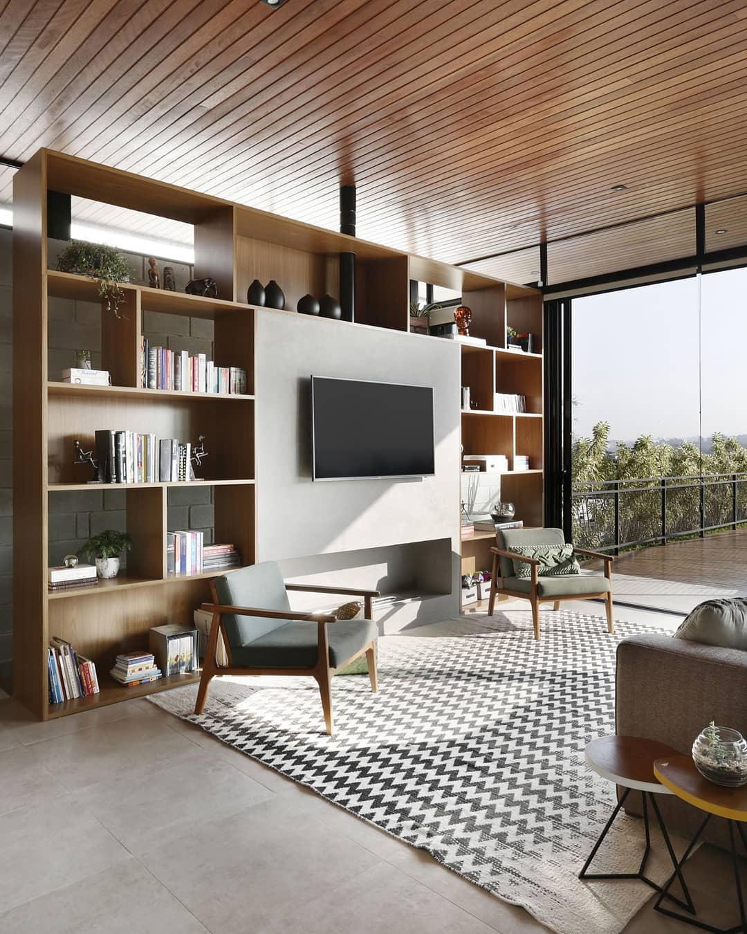Ruang keluarga dengan jendela membentang hingga ke ceiling ini mendapatkan kualitas cahaya dan udara yang baik. Terlebih lagi untuk ruang keluarga yang langsung berhimpitan dengan area luar taman yang dapat memberikan kesan bebas bernafas terhadap orang didalam rumah.