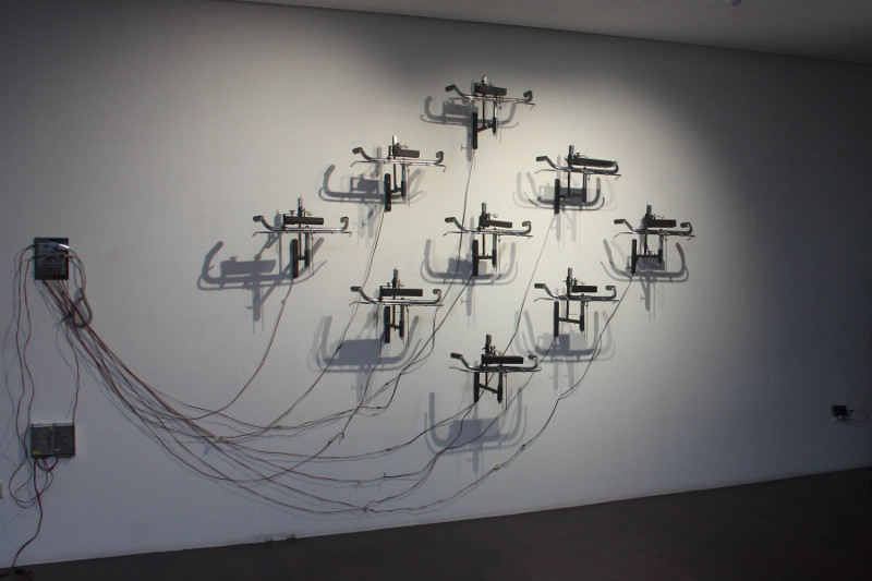Seniman yang biasa disapa Togar ini menampilkan rangkaian stang sepeda dengan mekanika mallet plastik pada setiap stang yang terhubung dengan sirkuit mesin.