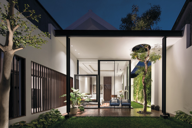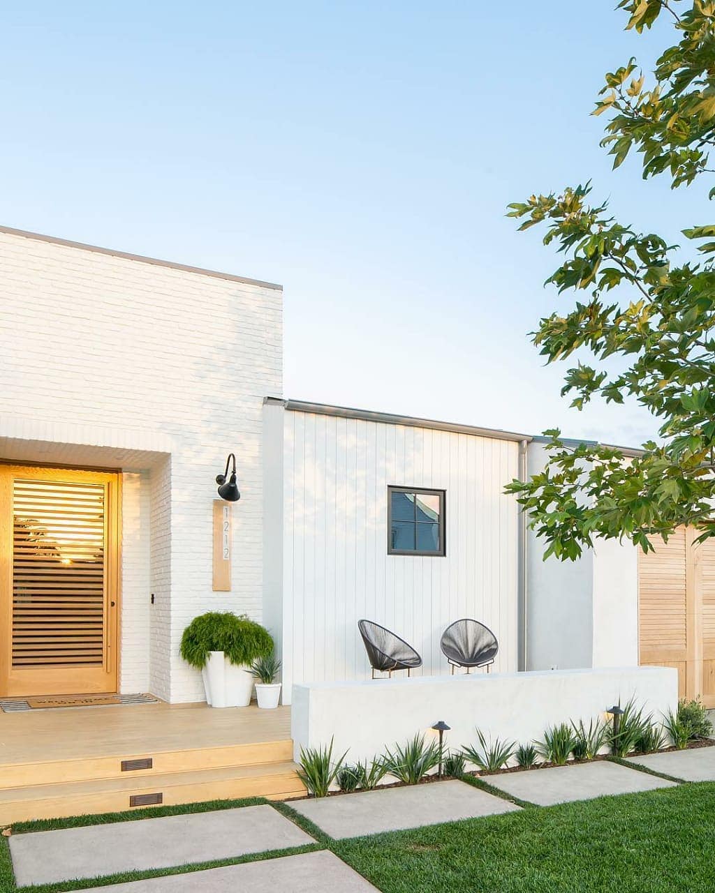 Menggabungkan dinding bata dan dinding kayu berwarna putih pada fasad memberikan kesan kontemporer pada rumah. Kehadiran warna alami kayu dan lantai pada teras menawarkan tampilan yang segar dilengkapi dengan tanaman hijau.