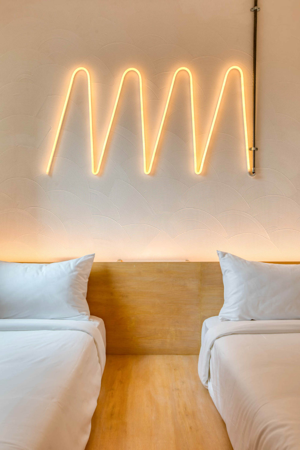 Sang arsitek sekaligus desainer interior asal Sydney, Akin Atelier memilih untuk mengarahkan jendela kamar ke area dalam hotel. Area dalam yang memiliki atap terbuka ini memungkinkan cahaya matahari dapat masuk dan direfleksikan dinding luar kamar hotel menjadi sebuah ruang yang penuh cahaya.