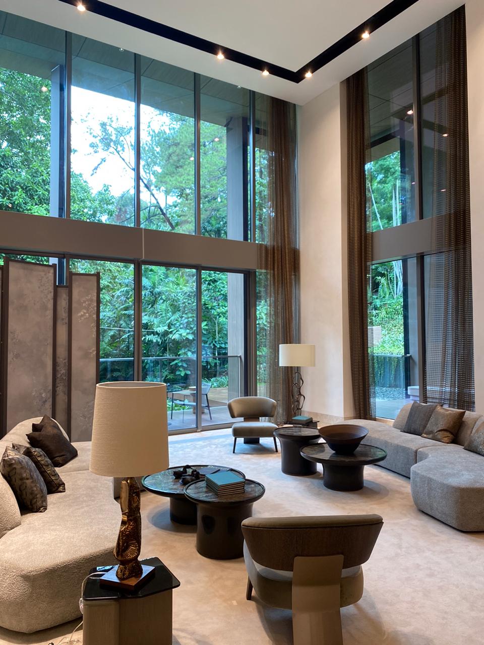 show unit untuk Tower I yang menampilkan ruang living dengan tinggi ceiling mencapai 6 meter / Savyavasa