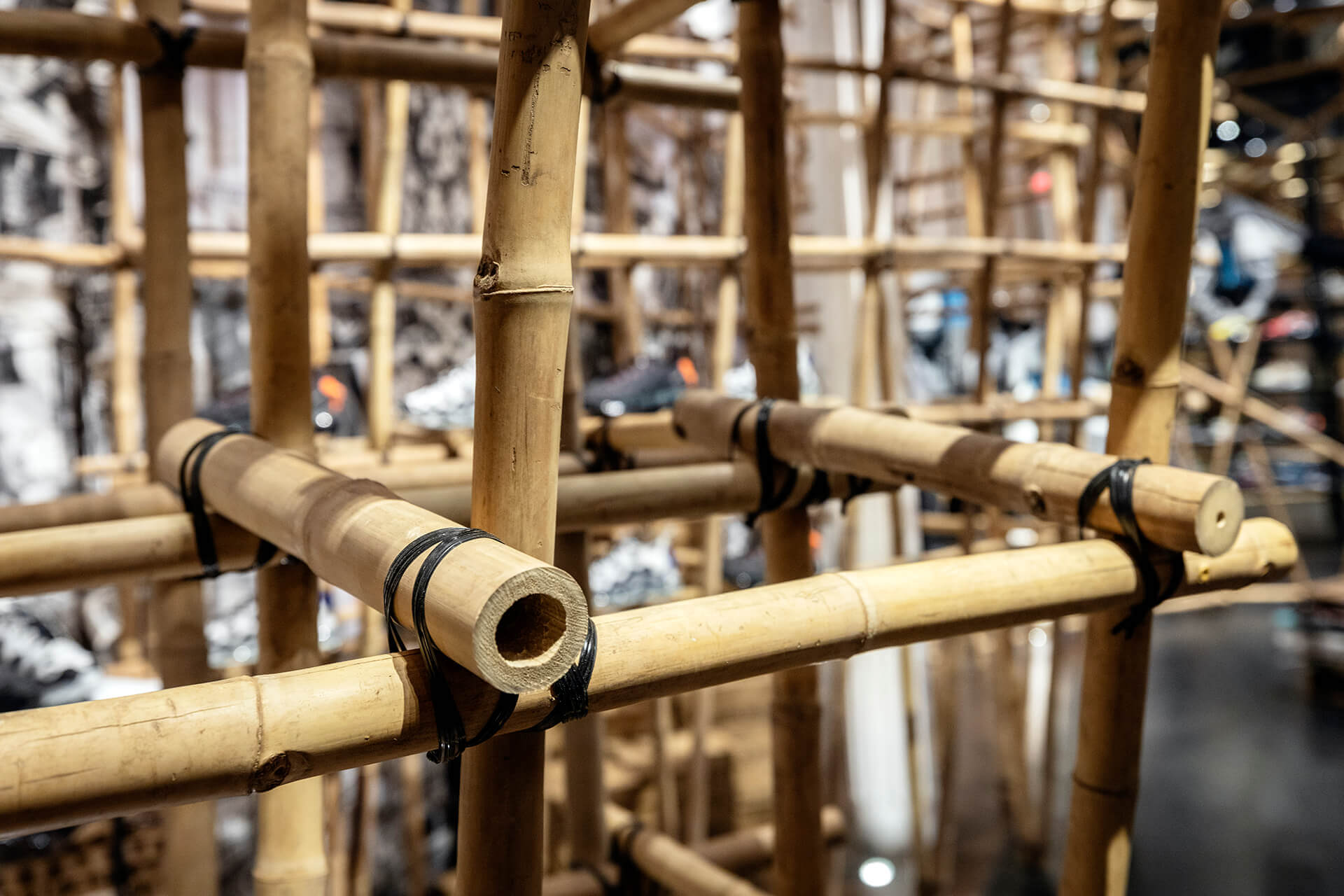 Kolaborasi Unik Sepatu Dengan Bambu di Sebuah Instalasi