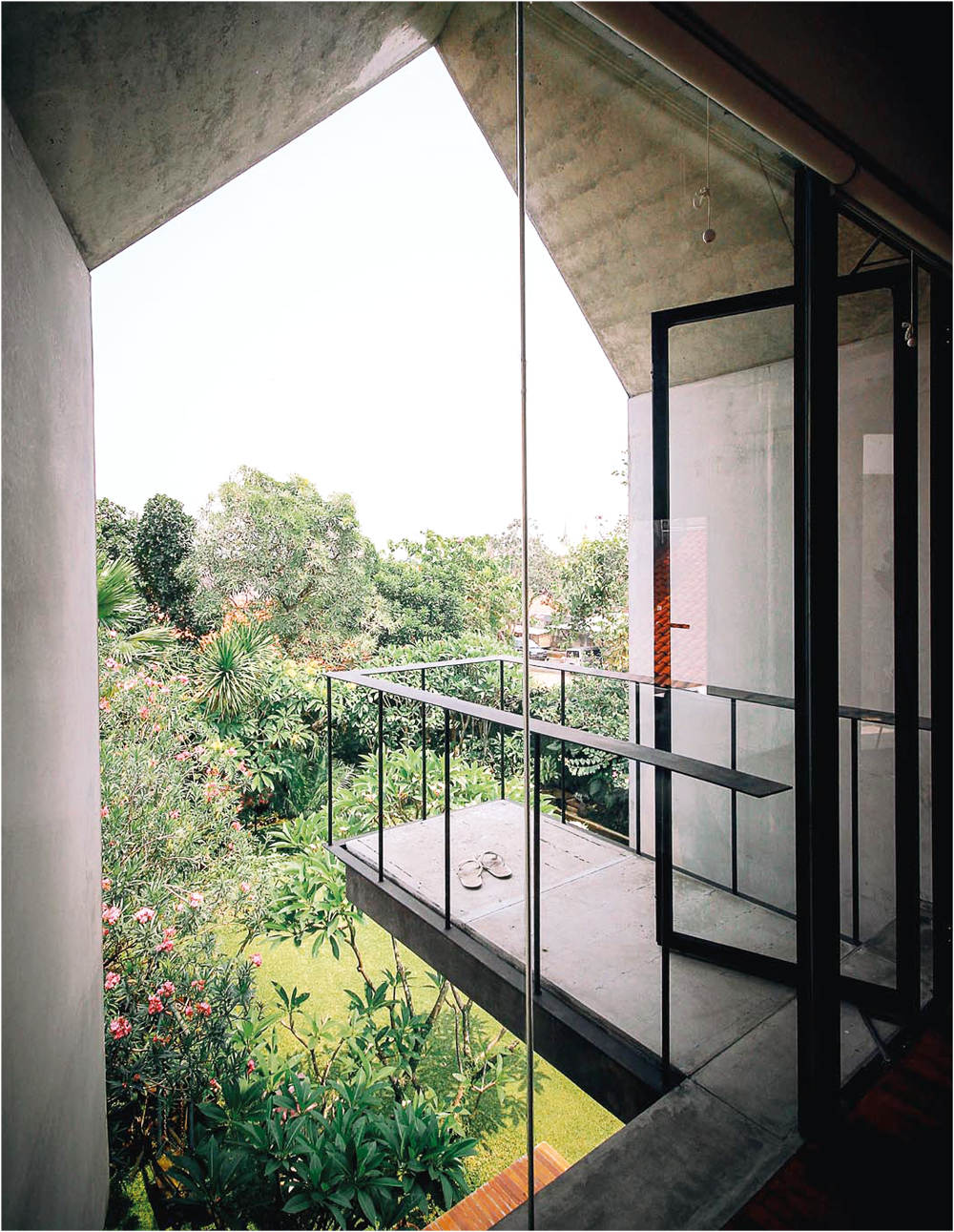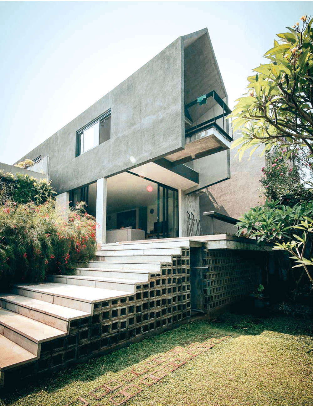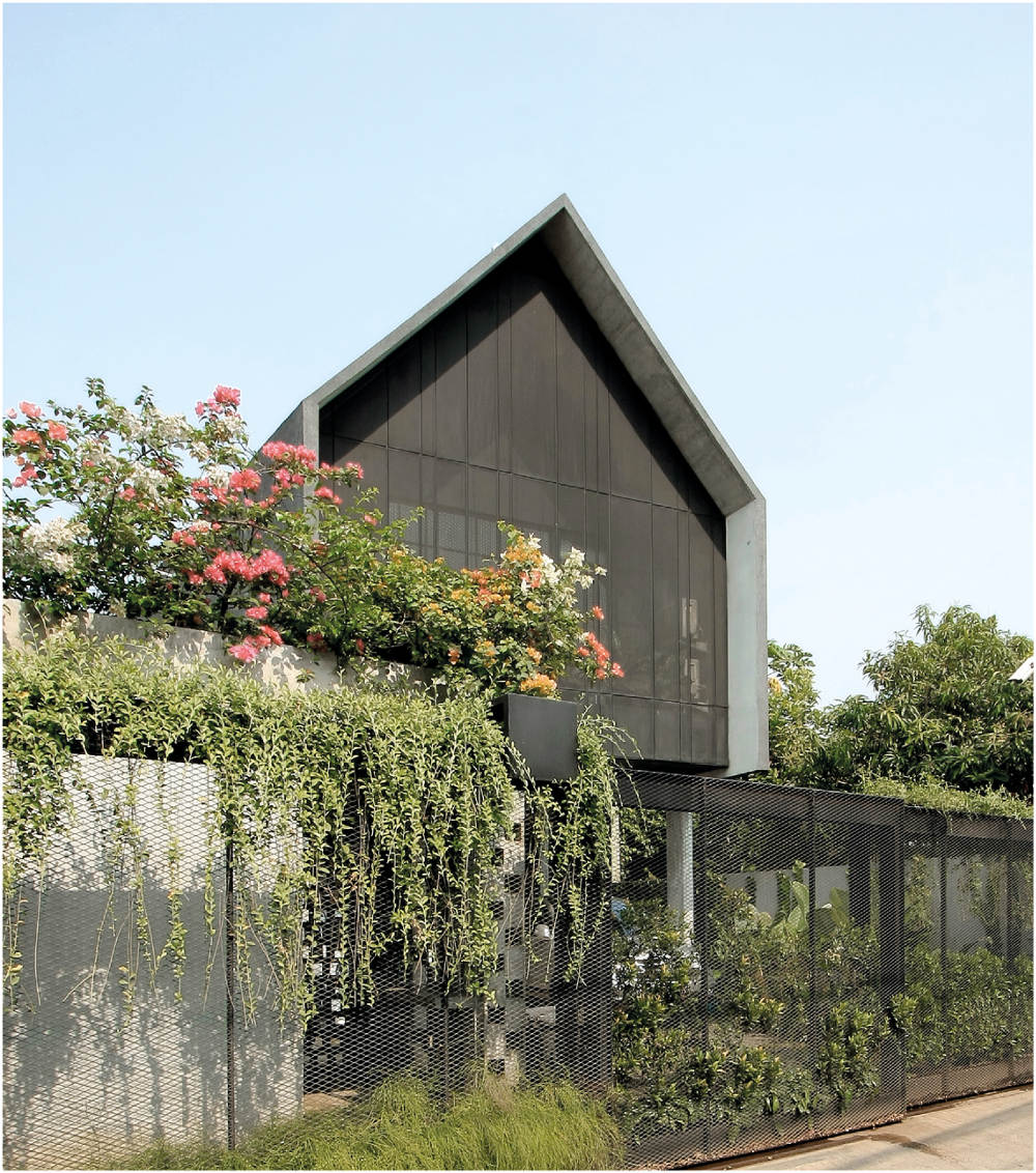 Dengan demikian, menciptakan bangunan baru di atas lahan dengan tetap mempertahankan area belakang tersebut menjadikan arah belakang hunian ini adalah fokus terbaiknya. Alhasil, formula rumah tropis menjadi landasan dalam mengolah hunian dengan luas tanah 750 meter persegi ini. Postur massa bangunan yang ramping digubah untuk merespon kondisi lahan dan hawa tropis lingkungannya.