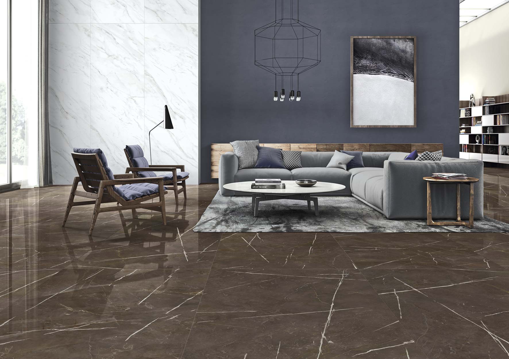 Di kategori Natural Stone yang berlapis glossy, motif Statuario dan Travertino paling mendekati karakter marmer asli, sedangkan Puplis bisa digunakan untuk memperkuat desain interior sebagai aksen yang lantang.