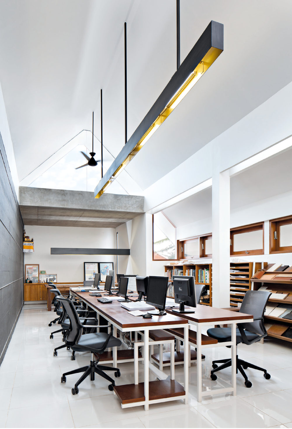 Fokus dalam nuansa kerja sangat penting, namun melihat alam di tengah kejenuhan bekerja dapat mengembalikan produktivitas. Berangkat dari konsep tersebut, di studio desain terdapat dua sisi bidang kaca besar yang membingkai langit dan cahaya matahari untuk dinikmati.
