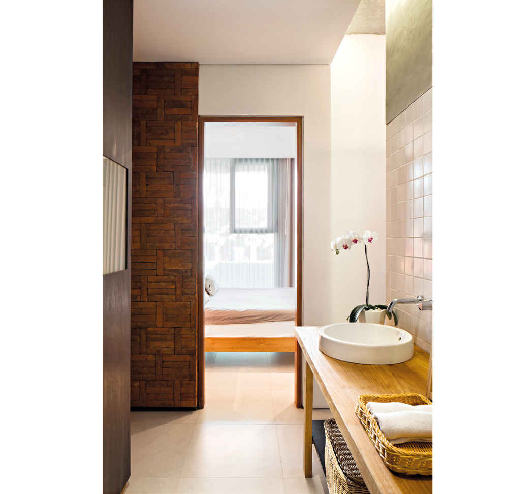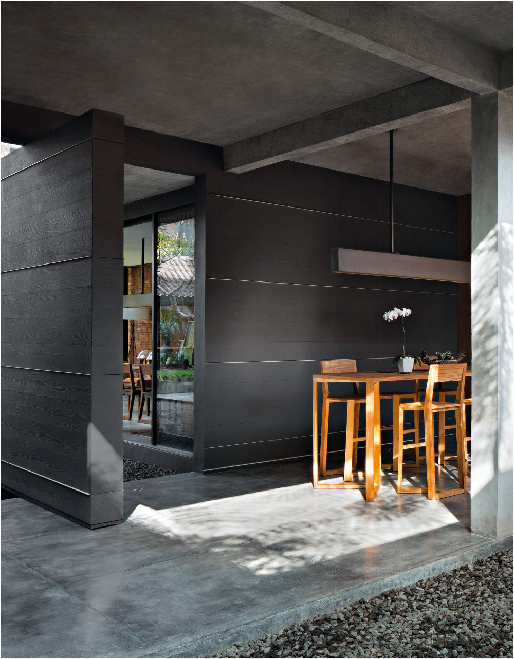 Warna hitam diaplikasikan untuk jendela, sliding doors, dan kolom dengan tujuan menambah nuansa maskulin. Keseluruhan furnitur memakai material kayu jati untuk menambahkan kesan klasik dan kehangatan,” papar Widiadnyana selaku founder Somia Design Studio.