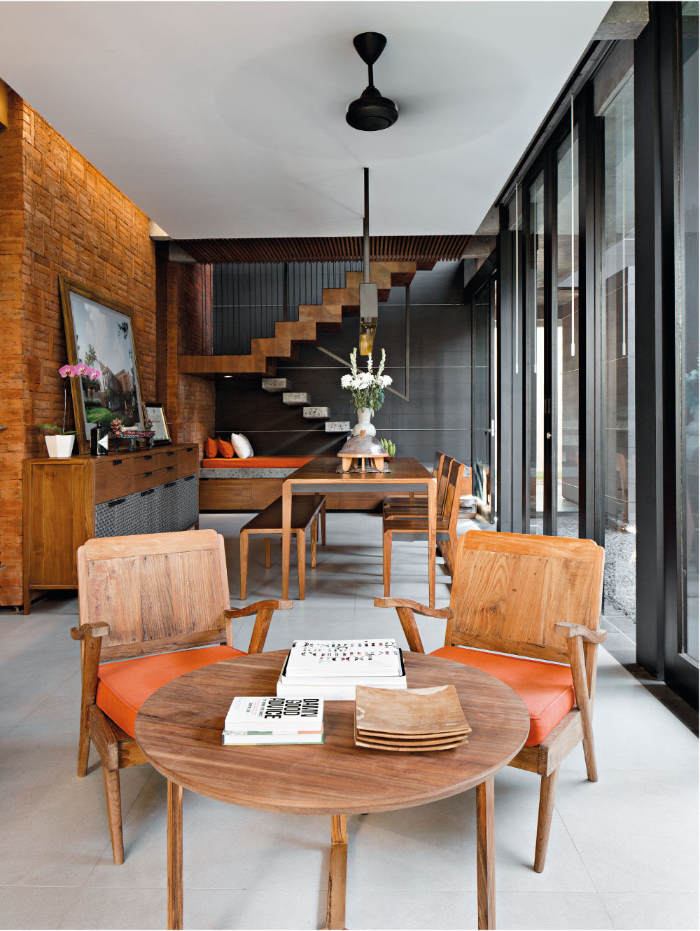 Konfigurasi bangunan banyak yang disederhanakan sehingga rumah terlihat terkomposisi dalam garis yang tersusun rapi. “Untuk memberikan suasana relaksasi, kami banyak memasukkan warna dan nuansa alam seperti batu bata merah ekspos di satu sisi dinding living dan dining room.