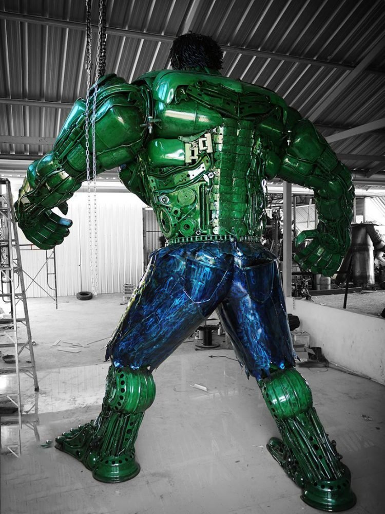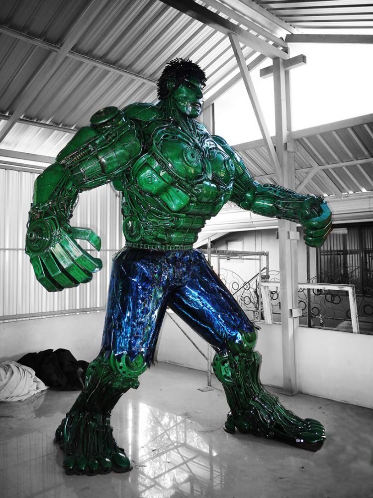 Telah menghasilkan banyak karya dengan skala berbeda, mulai dari menampilkan produk berukuran hanya 15 sentimeter hingga yang lebih dari tiga meter. Contohnya seperti salah satu karakter anggota Avengers ini, patung Hulk yang dibuat dari suku cadang mobil dan motor ini di daur ulang hingga berukuran 3,3 meter.