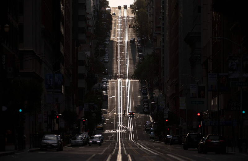 4. Jalan California di San Francisco, AS yang biasanya dipenuhi cable car kini terlihat lengang dampak dari COVID-19.