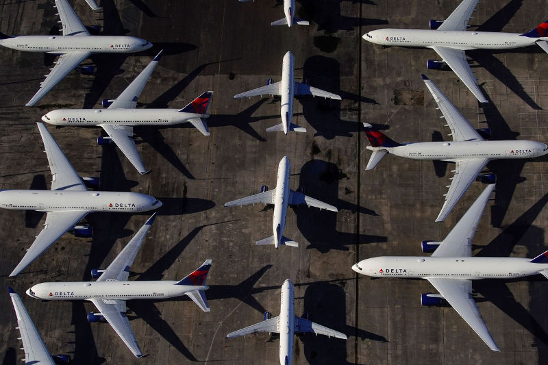 2. Pengurangan jam terbang akibat pandemi virus corona, pesawat Maskapai Delta Airlines terparkir di Bandara Internasional Birmingham-Shuttlesworth, Birmingham, Alabama, AS.