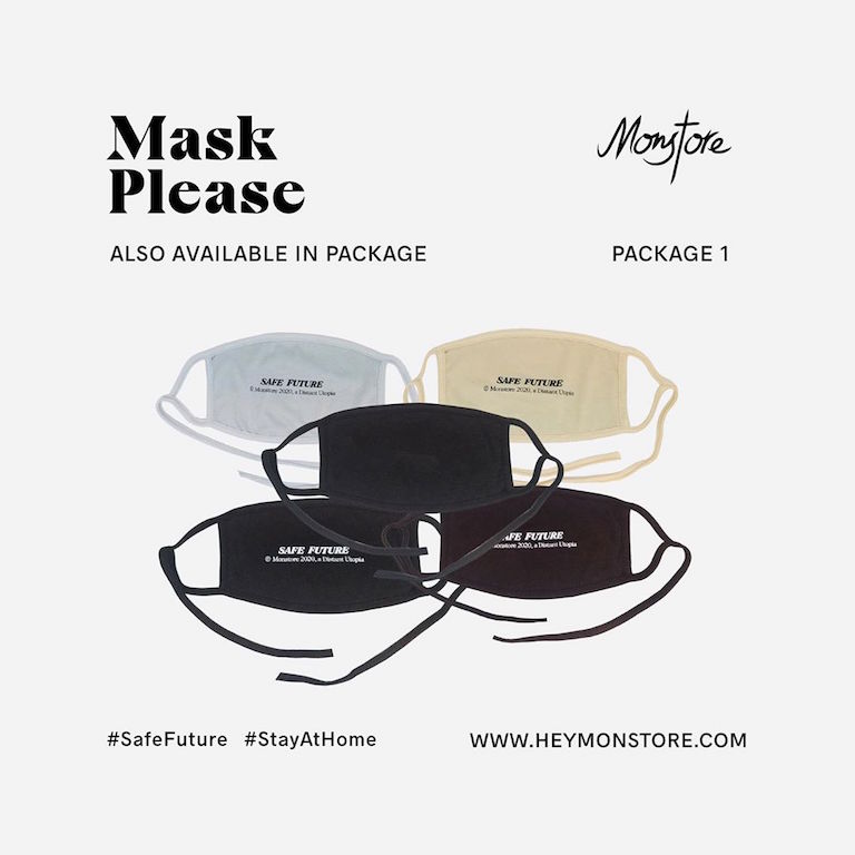 Masker kain dari Monstore juga terbuat dari bahan katun dan dapat dipakai berulang kali. Masker mereka didesain seperti gaya koleksi-koleksi mereka sebelumnya yang cenderung monokrom, dengan pilihan warna hitam, krem, dan abu muda.