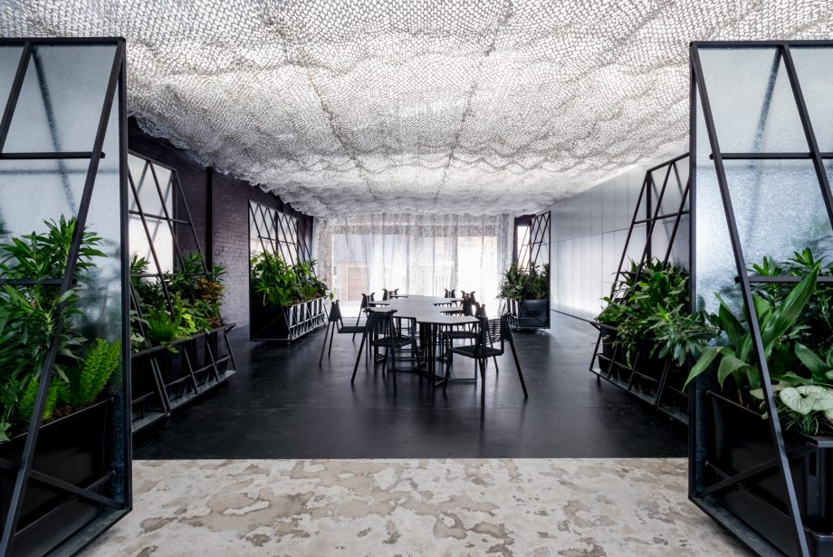 Jika Space & Time ingin diubah menjadi restoran, partisi garden wall menjadi sisi dalam yang membungkus susunan meja dan kursi untuk menampilkan kesan hangat dan natural.