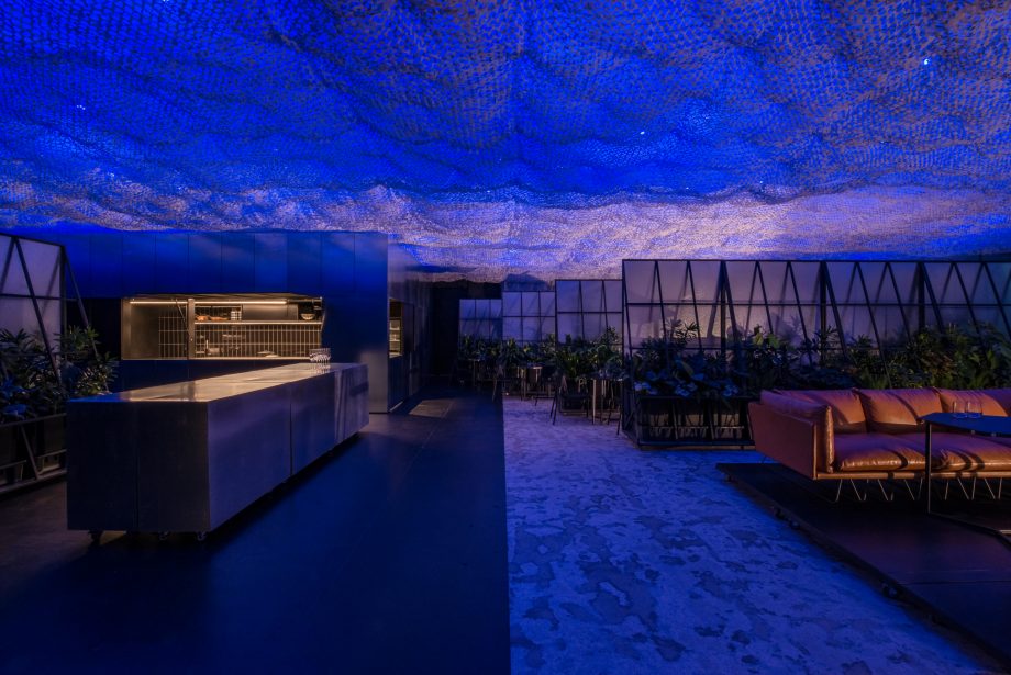 Pada bagian ceiling, lapisan nanotech fabric dan plastik ABS yang diiluminasi cahaya neon dari belakang menghadirkan pertunjukan magis serupa langit yang bergelombang.