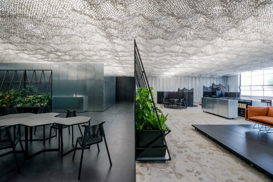 Partisi berupa garden wall dan screen warna perak yang dapat dipindah ini menjadi elemen krusial untuk mengofigurasi interior ruangan.