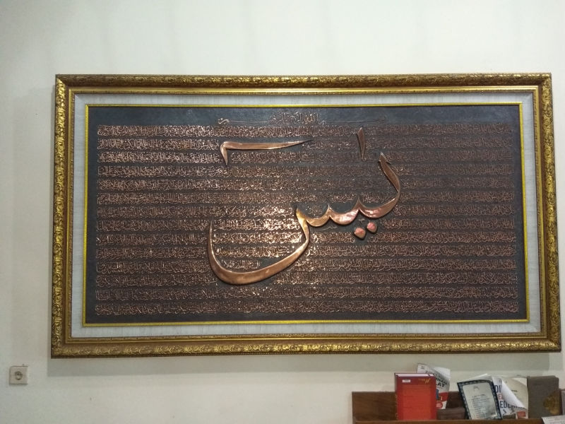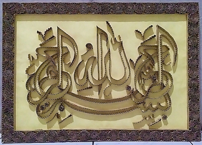 Salah satu yang sering digunakan adalah material kardus bekas. Jangan khawatir dengan kualitasnya, asal tidak terkena air, kaligrafi jenis ini memiliki tingkat ketahanan yang relatif baik.