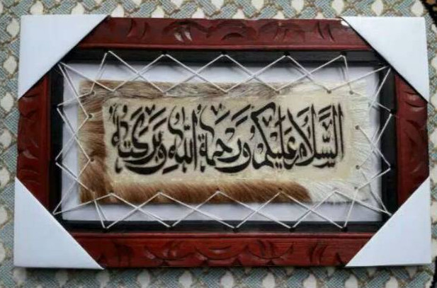Desain kaligrafi menggunakan material kulit menjadi desain yang relatif mudah ditemui. Kaligrafi yang biasanya dipigura ini menggunakan material kulit kambing yang digambar menggunakan teknik tatah sungging.