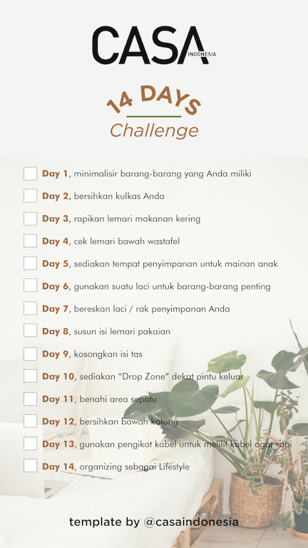 Merapikan rumah harus dimulai dari hal-hal kecil dan selangkah demi selangkah agar dapat bertahan dengan lama dan berefek secara long-term. Jika Anda bingung untuk memulai dari mana, CASA Indonesia telah menggabungkan beberapa hal di rumah yang patut di-organize. Berikut ini, 14 hal yang dapat Anda benahi untuk merubah hidup Anda dalam dua minggu.
