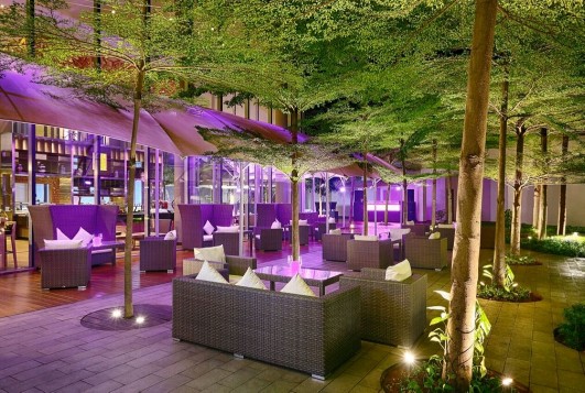 Nuansa interiornya terlihat sangat modern dengan penataan cahaya lampu warna indigo yang atraktif, cozy sofa, dan dikelilingi pohon Ketapang Kencana yang rindang menaungi sekeliling area lounge. IINDIGO Lounge yang menawarkan atmosfer unik ini juga menampilkan DJ dengan setlist lounge music yang sangat cocok dengan kaum urban ibu kota.
