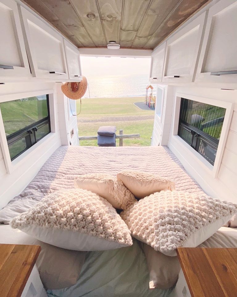Campervan home mereka secara keseluruhan dibuat ramah terhadap lingkungan termasuk matras tempat tidur, sarung bantal, sprei, dan selimut. Tempat tidur yang menggunakan matras lateks organik, di pagi hari ditransformasikan menjadi ruang kerja atau sofa yang nyaman lengkap dengan dekorasi yang terbuat dari bahan organik juga.