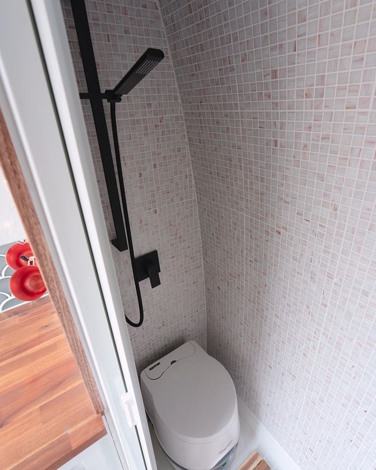 Memiliki shower diatas sebuah mobil sesuatu yang sangat sulit untuk diwujudkan apalagi jika membuat shower yang ramah lingkungan. Shower menjadi suatu hal yang paling sulit untuk dibangun bagi kedua pasangan ini yang mengutamakan material bangunan non-toxic. Pada akhirnya mereka menemukan glass tiles berukuran 3 mm yang ramah lingkungan dan memiliki perekat lem yang berbahan alami.