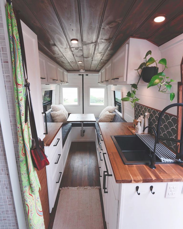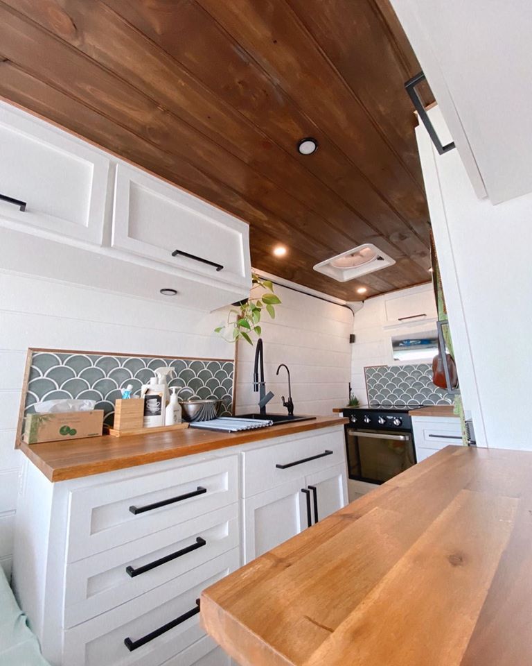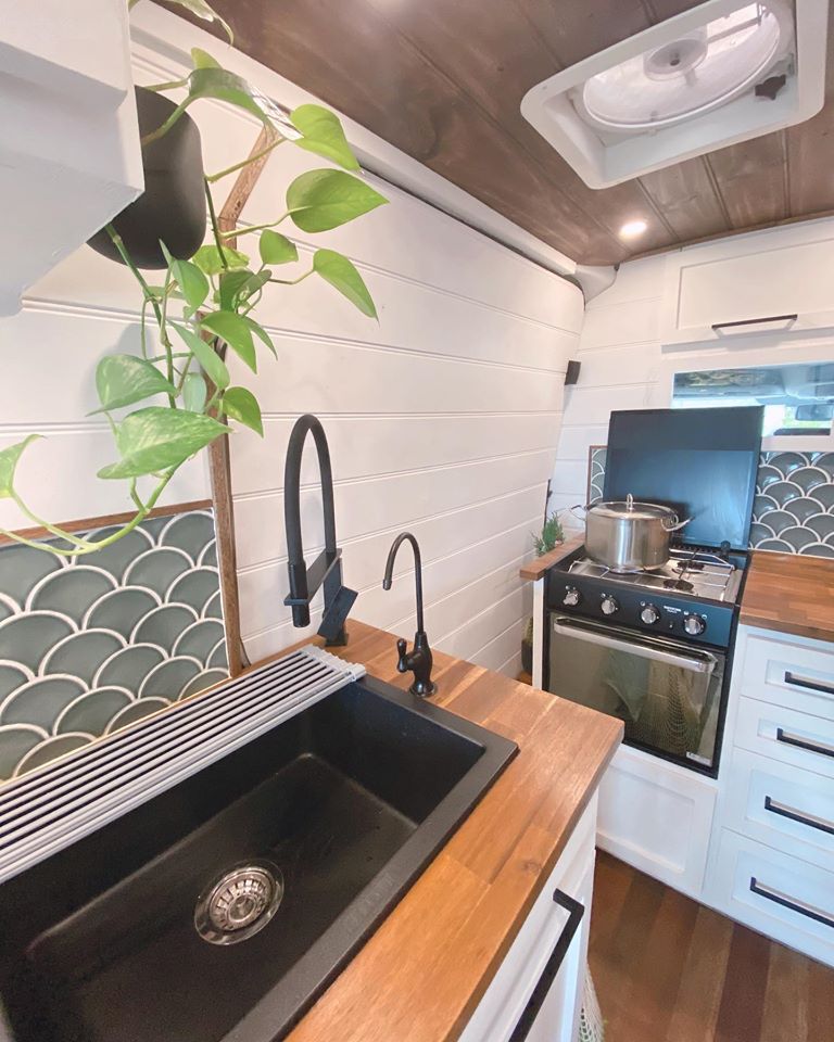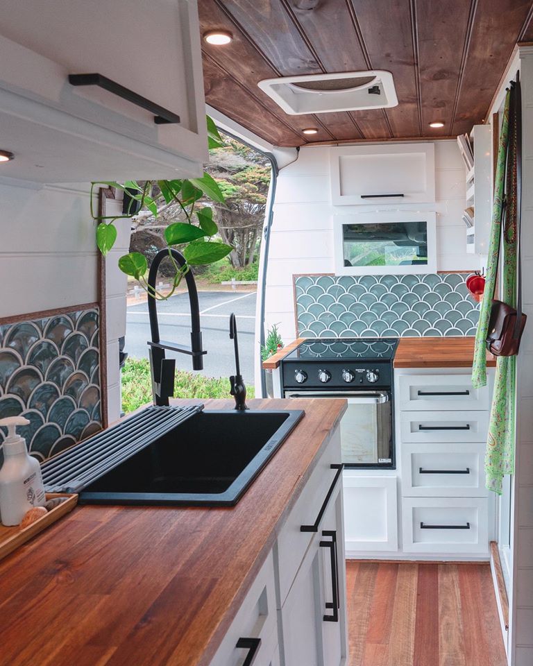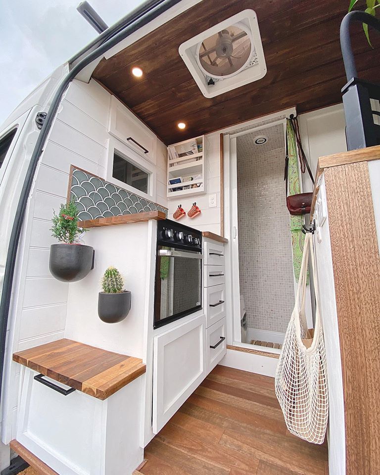 Salah satu hal yang menjadi suatu perhatian dalam membangun rumah di dalam suatu kendaraan adalah dapur. Anda tidak dapat berharap untuk memiliki kitchen set lengkap atau kompor yang terlalu besar maupun tinggi. Kedua pasangan ini memilih untuk tetap mengutamakan fungsionalitas dalam dapur mereka. Walau berukuran kecil, dapurnya lengkap buat heavy cooking, seperti memanggang dan baking.